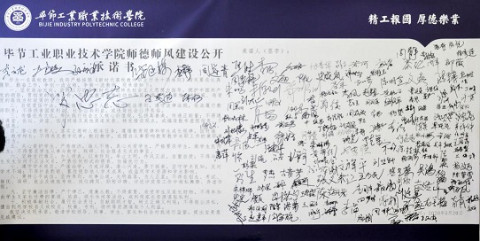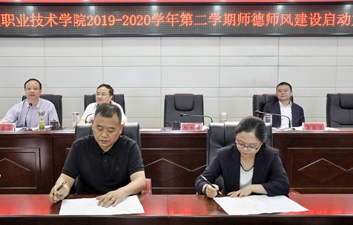 會上,院長與副院長,副院長與分管部門負(fù)責(zé)人,部門負(fù)責(zé)人與所屬教職員工層層簽訂師德師風(fēng)責(zé)任書;全院教職員工就師德師風(fēng)建設(shè)作出公開承諾并簽名。