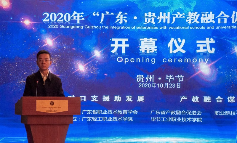 10月23日,廣東?貴州產(chǎn)教融合促進(jìn)大會在畢節(jié)隆重召開。廣東省教育廳巡視員朱俊文,貴州省教育廳一級巡視員鞠洪出席會議并致辭,畢節(jié)市委常委、副市長胡愛斌致歡迎辭,廣東輕工職業(yè)技術(shù)學(xué)院黨委書記杜安國作介紹,會議由畢節(jié)工業(yè)職業(yè)技術(shù)學(xué)院黨委副書記、院長邱國援全程主持。廣東省教育廳、貴州省教育廳、廣州市教育局、畢節(jié)市教育局相關(guān)負(fù)責(zé)人及參與產(chǎn)教融合大會的校企單位主要負(fù)責(zé)人參加會議。此次會議由廣東省職業(yè)技術(shù)教育學(xué)會、廣東省產(chǎn)教融合促進(jìn)會、職業(yè)院校協(xié)同發(fā)展聯(lián)盟主辦,廣東輕工職業(yè)技術(shù)學(xué)院、畢節(jié)工業(yè)職業(yè)技術(shù)學(xué)院承辦。