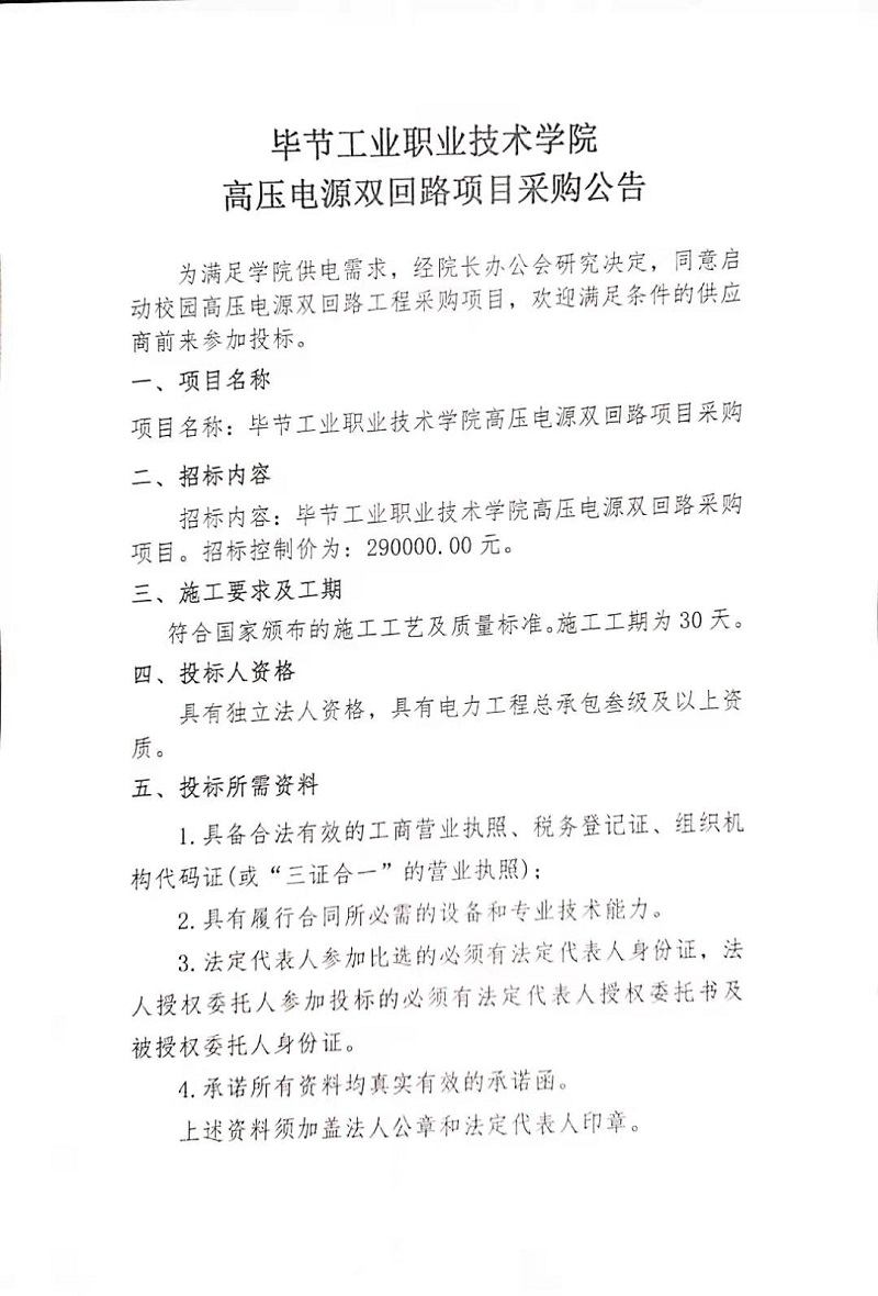 畢節(jié)工業(yè)職業(yè)技術(shù)學(xué)院高壓電源雙回路采購(gòu)項(xiàng)目中標(biāo)公告