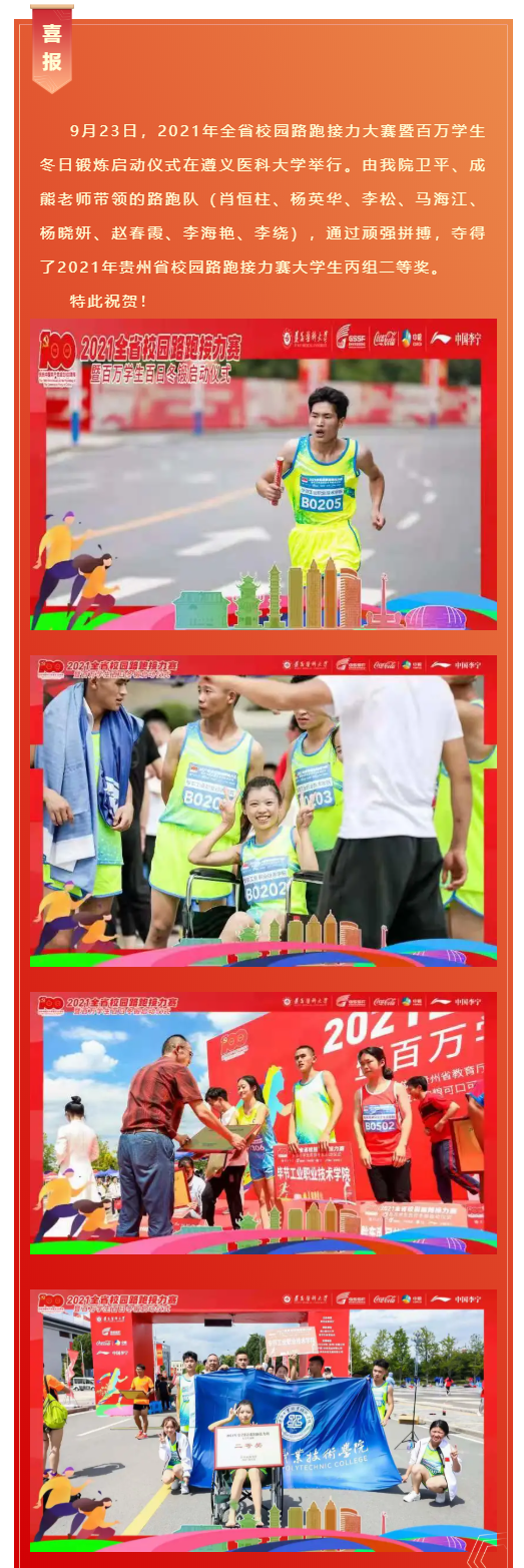 喜報(bào)!畢節(jié)工業(yè)職業(yè)技術(shù)學(xué)院奪得了2021年貴州省校園路跑接力賽大學(xué)生丙組二等獎(jiǎng)