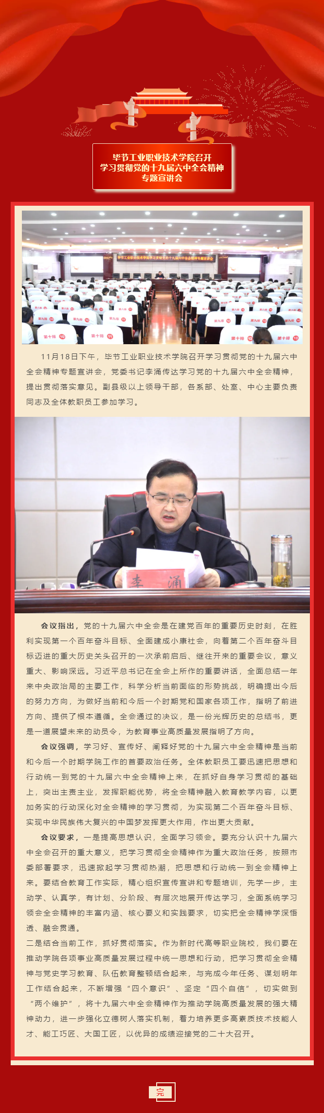 畢節(jié)工業(yè)職業(yè)技術(shù)學(xué)院召開學(xué)習(xí)貫徹黨的十九屆六中全會精神專題宣講會