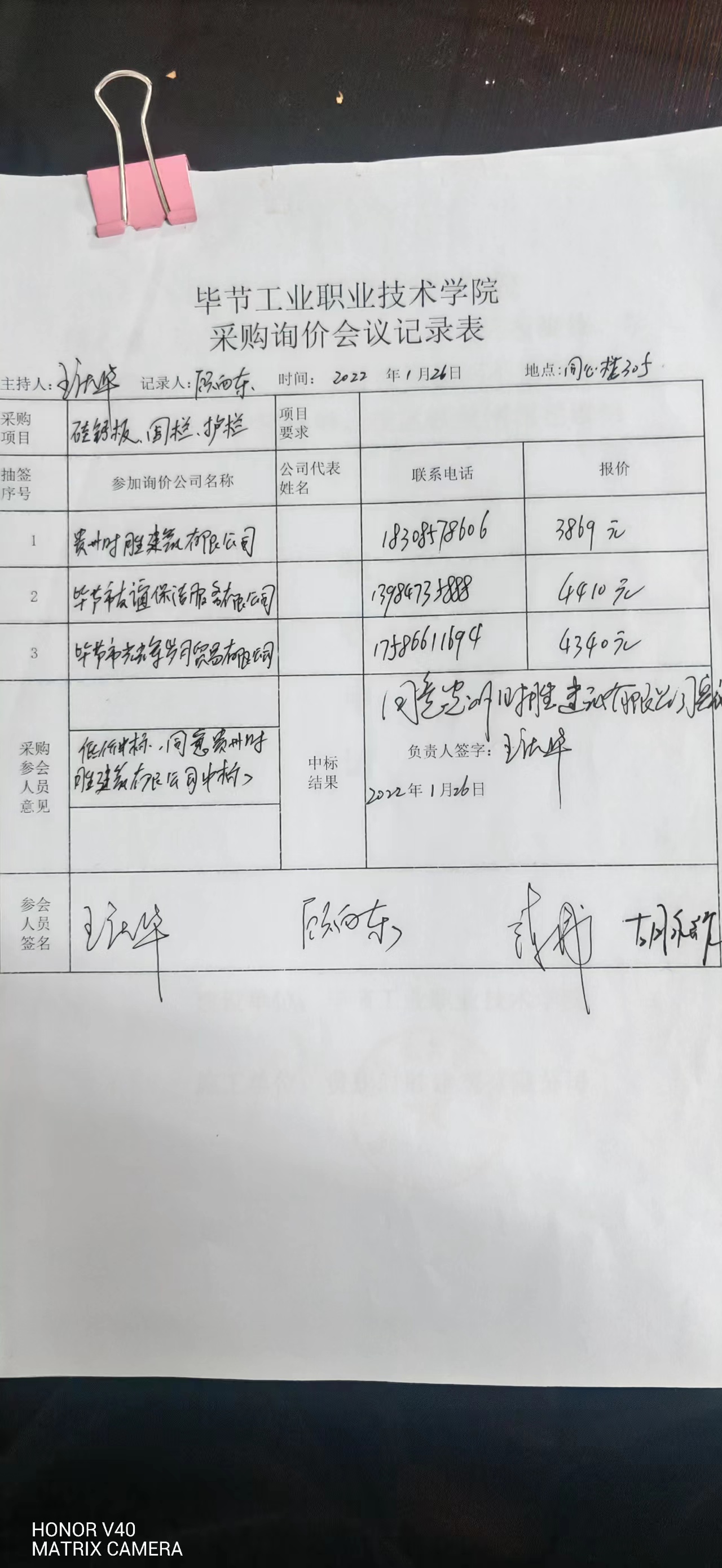 畢節(jié)工業(yè)職業(yè)技術(shù)學(xué)院硅鈣板、圍欄、護(hù)欄采購詢價(jià)會議記錄表