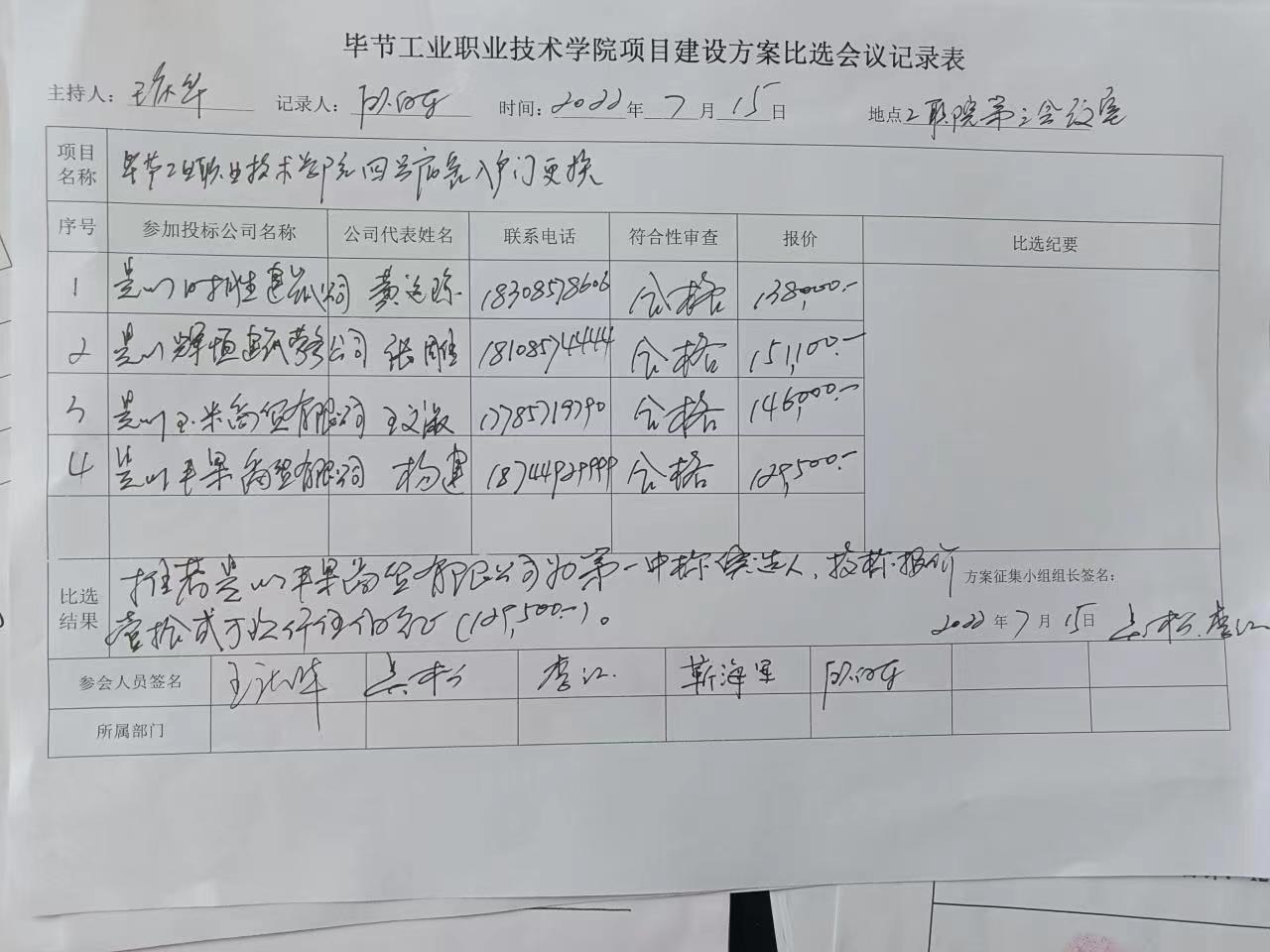 畢節(jié)工業(yè)職業(yè)技術(shù)學院四號宿舍入戶門更換比選結(jié)果公示