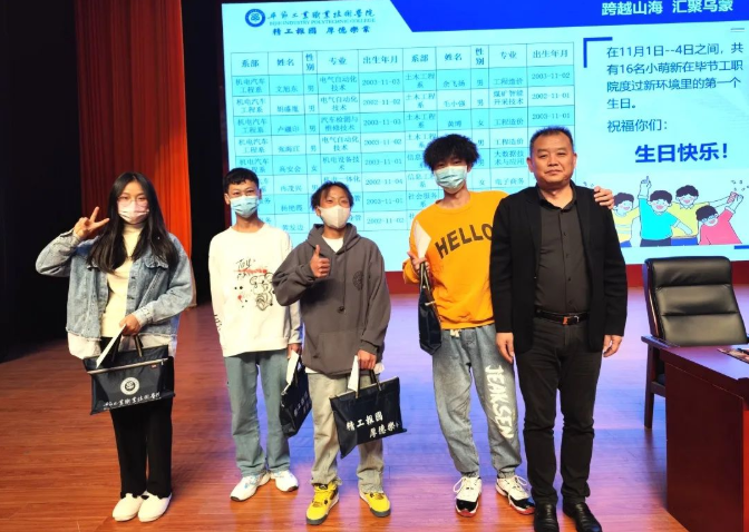 10月29日至11月1日,畢節(jié)工業(yè)職業(yè)技術(shù)學院迎來了近3000名“小可愛”。在11月2日-3日開展的“開學第一課“上,學院黨委副書記、院長邱國援為過生日的16位同學送上了一份精心準備的禮物,通過別樣的祝福引導新同學扣好人生的“第一??圩印保屗麄冊诔錆M驚喜和愉悅的氣氛下度過了進入畢節(jié)工職院的第一個特別的生日。