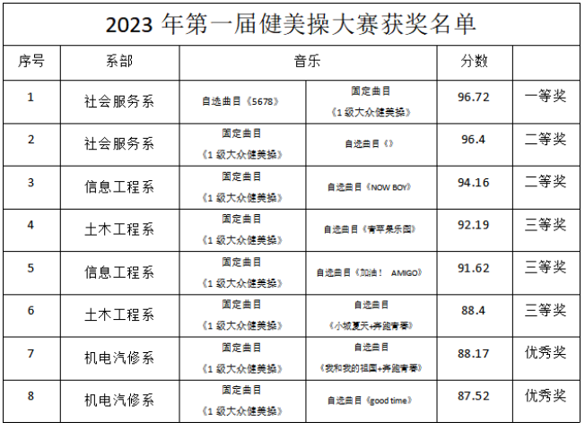 一個(gè)個(gè)優(yōu)美的身影 在田徑場(chǎng)上翩翩起舞 把青春之美展現(xiàn)得淋漓盡致 青春的力量 在陽光下燦爛 悅耳動(dòng)聽的旋律 輕盈曼妙的舞姿 在賽場(chǎng)上紛紛呈現(xiàn) 在此次健美操大賽中 參賽選手們?yōu)闃s譽(yù)而拼搏 為整個(gè)集體貢獻(xiàn)自己的力量 為自己的青春努力拼搏 精彩的表演結(jié)束后 通過評(píng)委的公正打分 共評(píng)選出八個(gè)獲獎(jiǎng)參賽隊(duì)伍 祝賀獲獎(jiǎng)隊(duì)伍和指導(dǎo)老師 愿大家一如既往、再接再厲