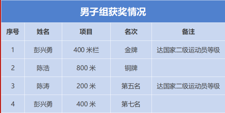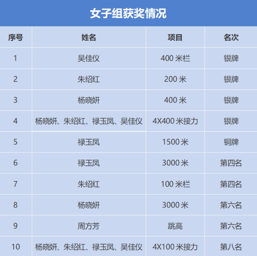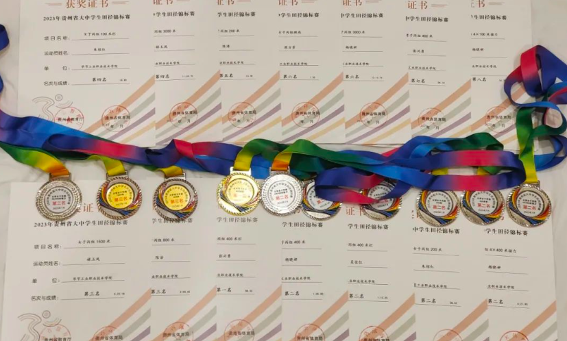 在2023年貴州省大中學(xué)生田徑錦標(biāo)賽中,我院田徑隊(duì)在冉光銘、成熊、衛(wèi)平三位教練員的帶領(lǐng)下頑強(qiáng)拼搏、團(tuán)結(jié)奮戰(zhàn),圓滿完成了各項(xiàng)賽事,共獲得獎(jiǎng)牌10枚,其中金牌1枚、銀牌7枚、銅牌2枚,7人次獲得4-8名,2人達(dá)國家二級(jí)運(yùn)動(dòng)員等級(jí),榮獲團(tuán)體總分第五名。