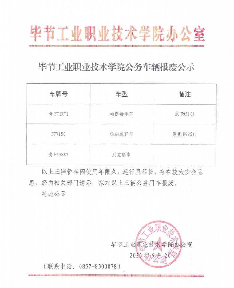 畢節(jié)工業(yè)職業(yè)技術(shù)學(xué)院公務(wù)車輛報廢公示