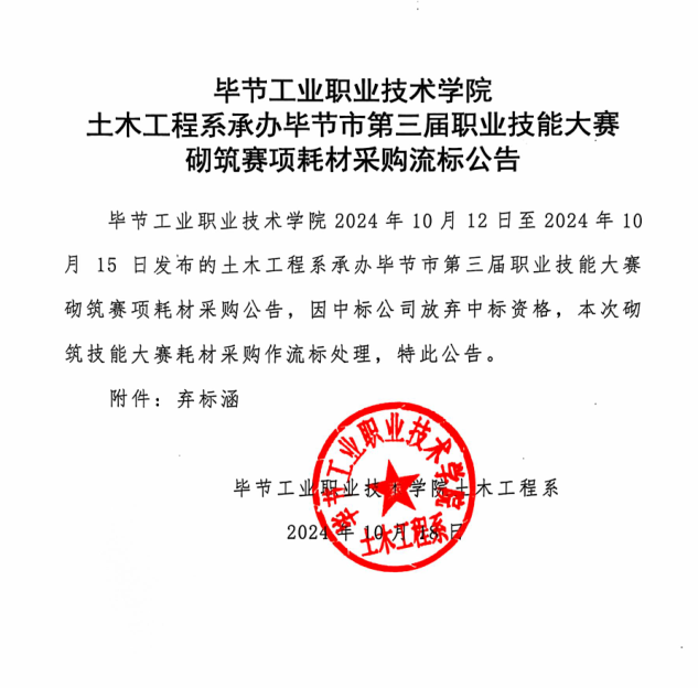 畢節(jié)工業(yè)職業(yè)技術(shù)學(xué)院土木工程系承辦畢節(jié)市第三屆職業(yè)技能大賽砌筑賽項(xiàng)耗材采購流標(biāo)公告