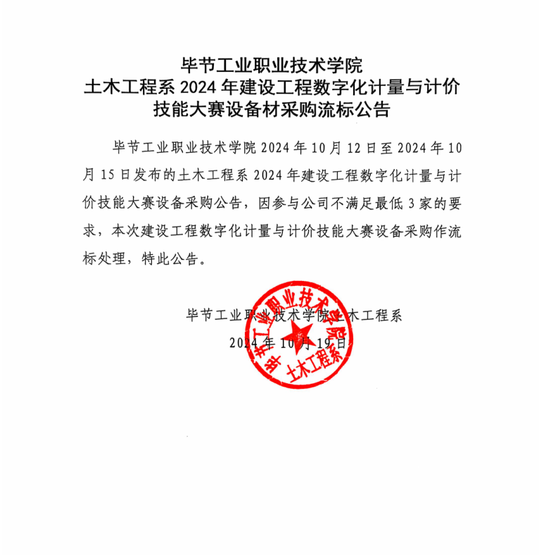 畢節(jié)工業(yè)職業(yè)技術(shù)學(xué)院土木工程系2024年建設(shè)工程數(shù)字化計(jì)量與計(jì)價(jià)技能大賽設(shè)備耗材采購(gòu)流標(biāo)公告