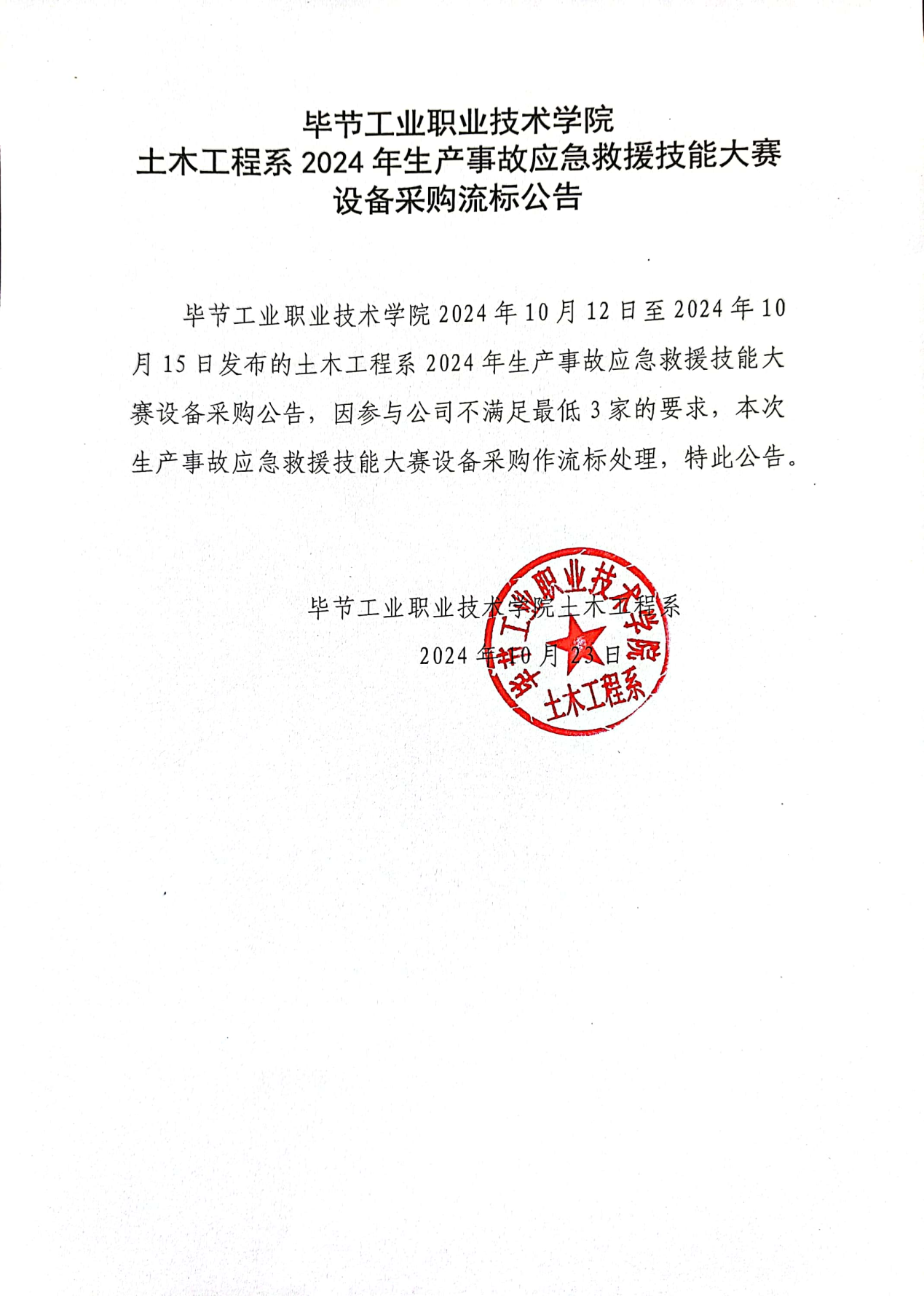畢節(jié)工業(yè)職業(yè)技術(shù)學(xué)院土木工程系2024年生產(chǎn)事故應(yīng)急救援技能大賽設(shè)備采購(gòu)流標(biāo)公告