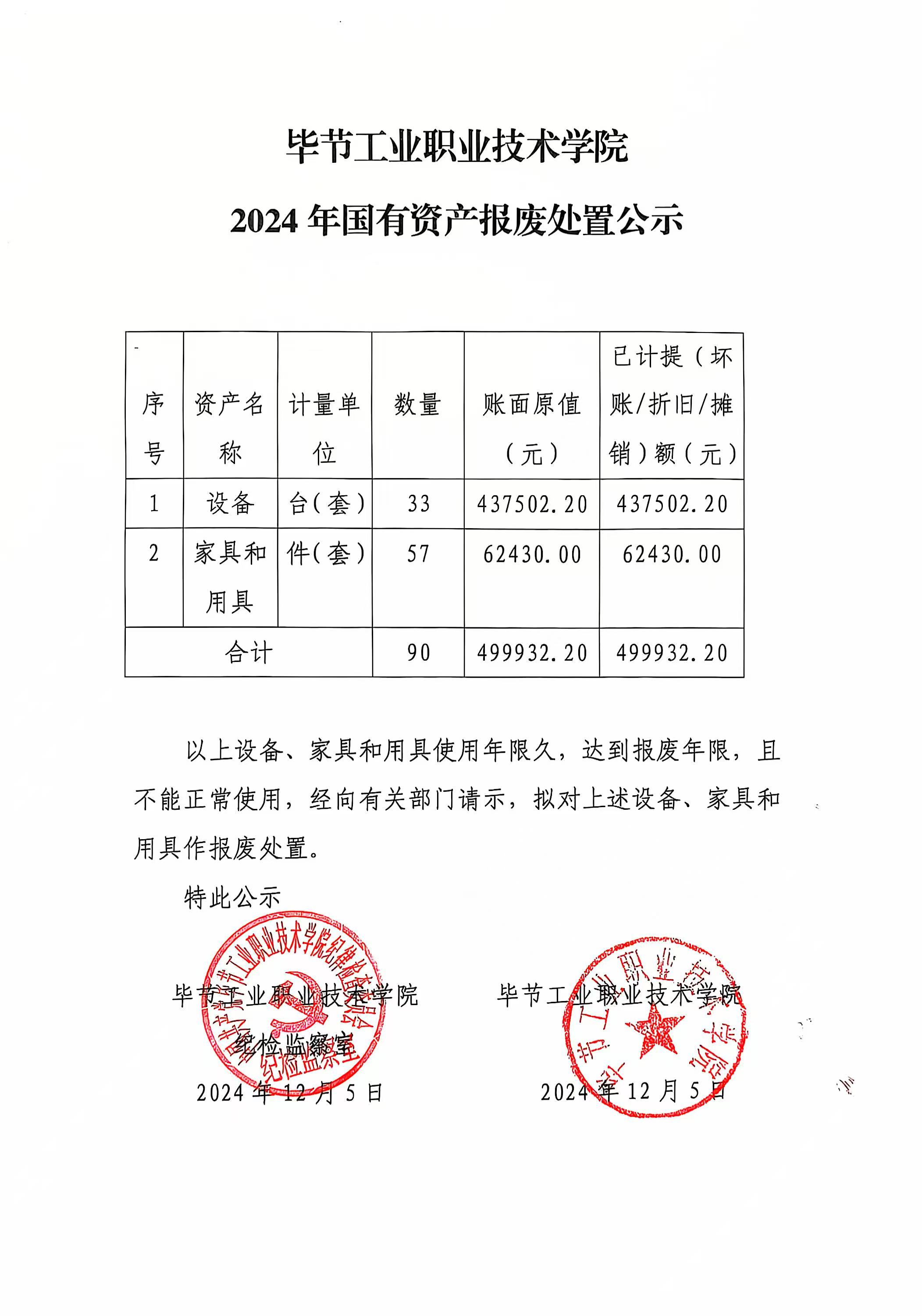 畢節(jié)工業(yè)職業(yè)技術(shù)學(xué)院2024年國(guó)有資產(chǎn)報(bào)廢處置公示