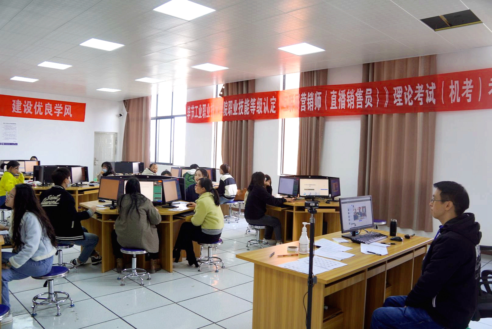 為了促進(jìn)我院“雙師型”隊伍建設(shè),提升教師技能成長,弘揚(yáng)工匠精神,經(jīng)貴州省職業(yè)技能鑒定指導(dǎo)中心批準(zhǔn),我院2023年第二批職業(yè)技能等級認(rèn)定考試--《直播銷售員》(三、四級)考試工作圓滿完成。