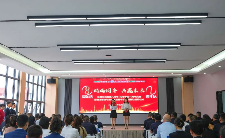 5月12日,畢節(jié)工業(yè)職業(yè)技術(shù)學(xué)院拓海學(xué)院一周年成立儀式暨畢節(jié)工業(yè)職業(yè)技術(shù)學(xué)院酒店管理與數(shù)字化運營專業(yè)實訓(xùn)基地簽約儀式在拓海學(xué)院會議室舉行。學(xué)院黨委副書記、院長邱國援,黨委委員、副院長黃瑛、黃河、吳家文、黃文碧,拓海學(xué)院名譽院長、拓海生活集團總裁楊月強,拓海學(xué)院院長林彬出席儀式,拓海集團相關(guān)領(lǐng)導(dǎo)、員工代表及學(xué)院社會服務(wù)系師生代表參加儀式。 儀式現(xiàn)場 邱國援在致辭中指出,校企雙方共建拓海學(xué)院實訓(xùn)基地,為相關(guān)專業(yè)學(xué)生提供了理實一體化教學(xué)場地和實習(xí)實訓(xùn)平臺,改善了物業(yè)管理、酒店管理等專業(yè)的教學(xué)、實訓(xùn)條件,使我院辦學(xué)條件、人才培養(yǎng)體系和教學(xué)質(zhì)量得到不斷提高。同時,拓海集團積極參與物業(yè)管理專業(yè)人才培養(yǎng)方案修訂,從行業(yè)、企業(yè)角度提出了很多人才培養(yǎng)的意見建議,邀請行業(yè)專家來校講學(xué),親自授課,使學(xué)生專業(yè)知識得到有力提升,使物業(yè)管理專業(yè)人才培養(yǎng)體系更加符合行業(yè)需求。下一步,希望校企雙方繼續(xù)深化校企合作機制、持續(xù)擴大合作范圍、協(xié)同提升合作質(zhì)量,充分發(fā)揮拓海生活服務(wù)集團在物業(yè)管理方面的專業(yè)優(yōu)勢,在人才培養(yǎng)方案、課程教學(xué)、實習(xí)實訓(xùn)、教師培養(yǎng)等方面提供企業(yè)建議和技術(shù)指導(dǎo),在教育教學(xué)、學(xué)生管理、素質(zhì)培養(yǎng)、技能提升等方面與學(xué)院交換經(jīng)驗,提升教師專業(yè)素質(zhì),強化學(xué)生技能提升,推進“工學(xué)結(jié)合”教學(xué)模式,共同提高學(xué)院育人質(zhì)量。 邱國援在儀式上致辭 楊月強表示,過去一年,校企雙方本著優(yōu)勢互補、資源共享、互惠雙贏、共同發(fā)展的原則,對校企合作模式進行了深層次的探索、創(chuàng)新與實踐,拓海學(xué)院的成立不僅推動了產(chǎn)教融合,也為學(xué)生提供了優(yōu)質(zhì)的實訓(xùn)基地,為企業(yè)提供了強有力的人才保障。下一步,企業(yè)將繼續(xù)聯(lián)手學(xué)院不斷創(chuàng)新,共同培養(yǎng)高素質(zhì)技術(shù)技能型人才,構(gòu)建校企合作雙贏局面,助推職業(yè)教育改革和地方經(jīng)濟社會高質(zhì)量發(fā)展。 楊月強在儀式上講話 儀式上,邱國援代表學(xué)院與拓海生活集團簽訂了《畢節(jié)工業(yè)職業(yè)技術(shù)學(xué)院酒店管理與數(shù)字化運營專業(yè)實訓(xùn)基地(中心)建設(shè)合作協(xié)議》。學(xué)院與拓海生活集團將再次攜手,共建畢節(jié)工業(yè)職業(yè)技術(shù)學(xué)院酒店管理與數(shù)字化運營專業(yè)實訓(xùn)基地,共同承擔(dān)科研項目、實現(xiàn)信息共享,培養(yǎng)更多高質(zhì)量的技能人才,為畢節(jié)全面推進鄉(xiāng)村振興提供有力的人才支撐。 簽約儀式現(xiàn)場 拓海學(xué)院院長林斌、社會服務(wù)系主任呂振欣為優(yōu)秀學(xué)生羅達麗、李定奎頒發(fā)榮譽證書 優(yōu)秀學(xué)生代表羅達麗發(fā)言 儀式中的精彩節(jié)目